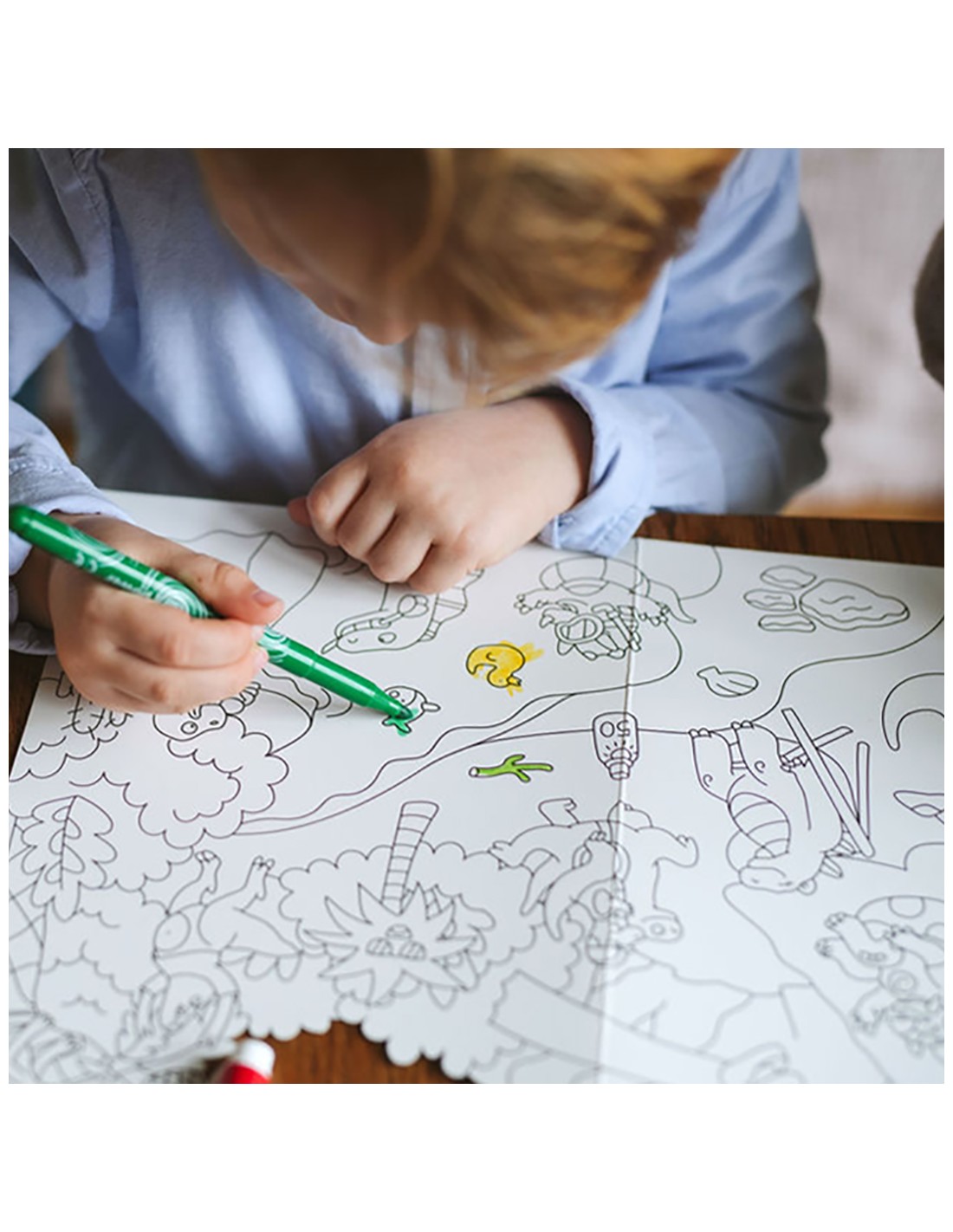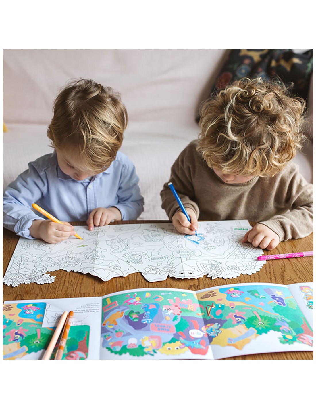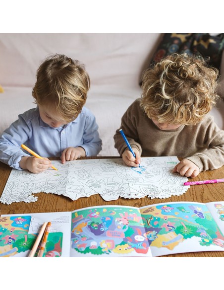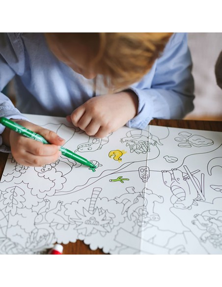 Τα παιδιά ξεκινούν από τον χρωματισμό της μίας πλευράς της αφίσας, χρησιμοποιώντας τις δικές τους επιλογές χρωμάτων. Ασχολούνται με τη λεπτομέρεια, παρατηρούν τα σχήματα, δίνουν ζωή στους χαρακτήρες – και με κάθε πινελιά, αναπτύσσουν: