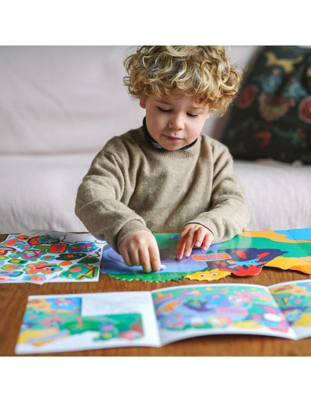 Η δεύτερη πλευρά της αφίσας προσφέρει την ευκαιρία για διακόσμηση με αυτοκόλλητα. Τα φωτεινά, φλουο αυτοκόλλητα ενισχύουν τη φαντασία και επιτρέπουν στο παιδί να πειραματιστεί με θέσεις, συνθέσεις και σχέσεις ανάμεσα στους χαρακτήρες.