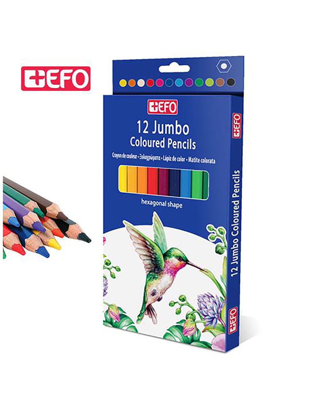 Ξυλοχρώματα υψηλής ποιότητας +Efo. Τα ξυλοχρώματα +Efo Jumbo είναι κατάλληλα για μικρά παιδιά . Ο μαλακός πυρήνας τους, με υψηλή συγκέντρωση χρώματος, δίνει την δυνατότητα ομαλής εφαρμογής, χωρίς μεγάλη πίεση. Το εξάγωνο σχήμα τους βοηθάει στο καλό έλεγχο κατά την χρήση.