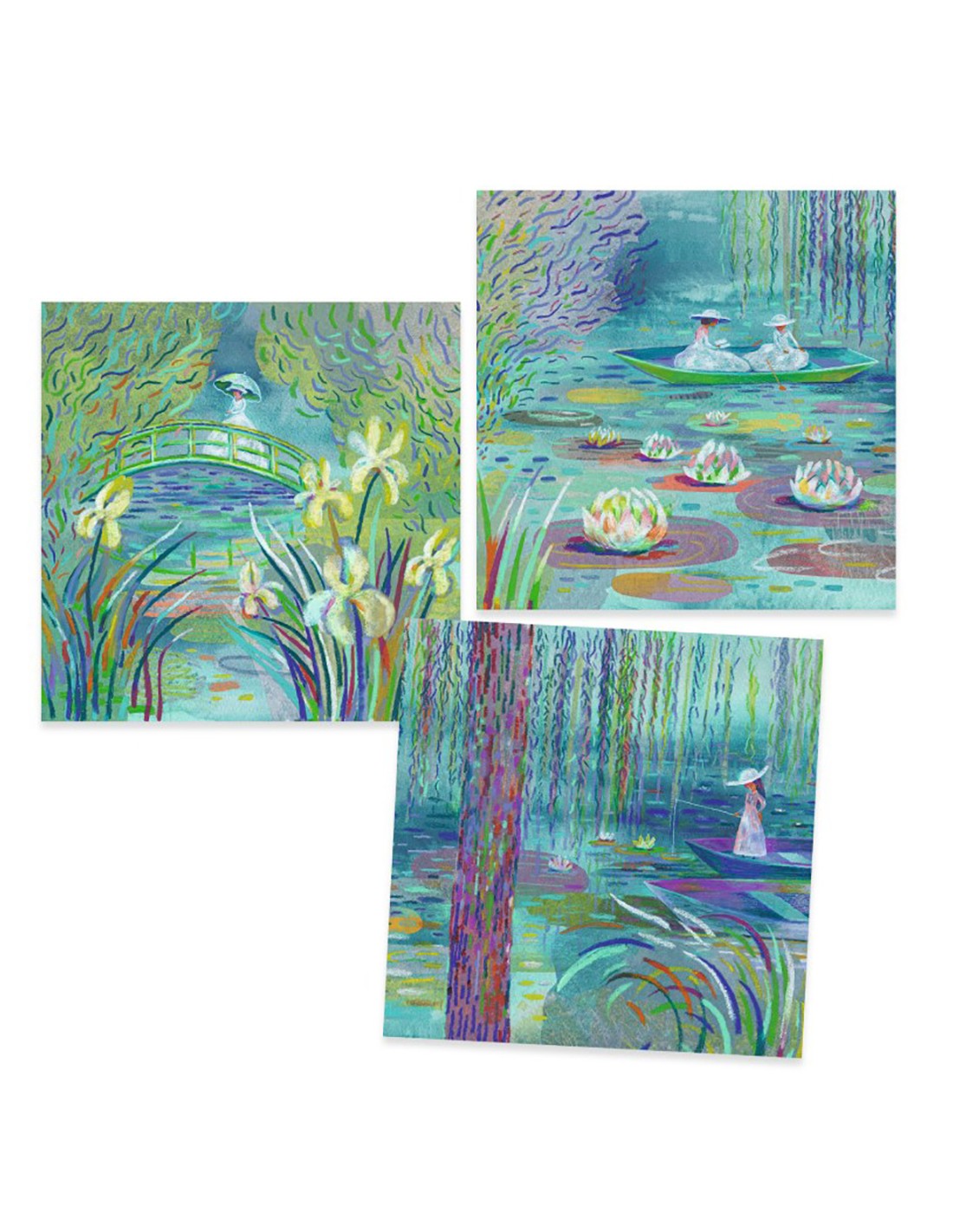 Ολοκληρώστε έναν τρίπτυχο πίνακα εμπνευσμένο από τα διάσημα "Νούφαρα" που υπήρξαν πρωταγωνιστικό μοτίβο σε πολλά έργα του διάσημου ζωγράφου, με τη χρήση λαδοπαστέλ.