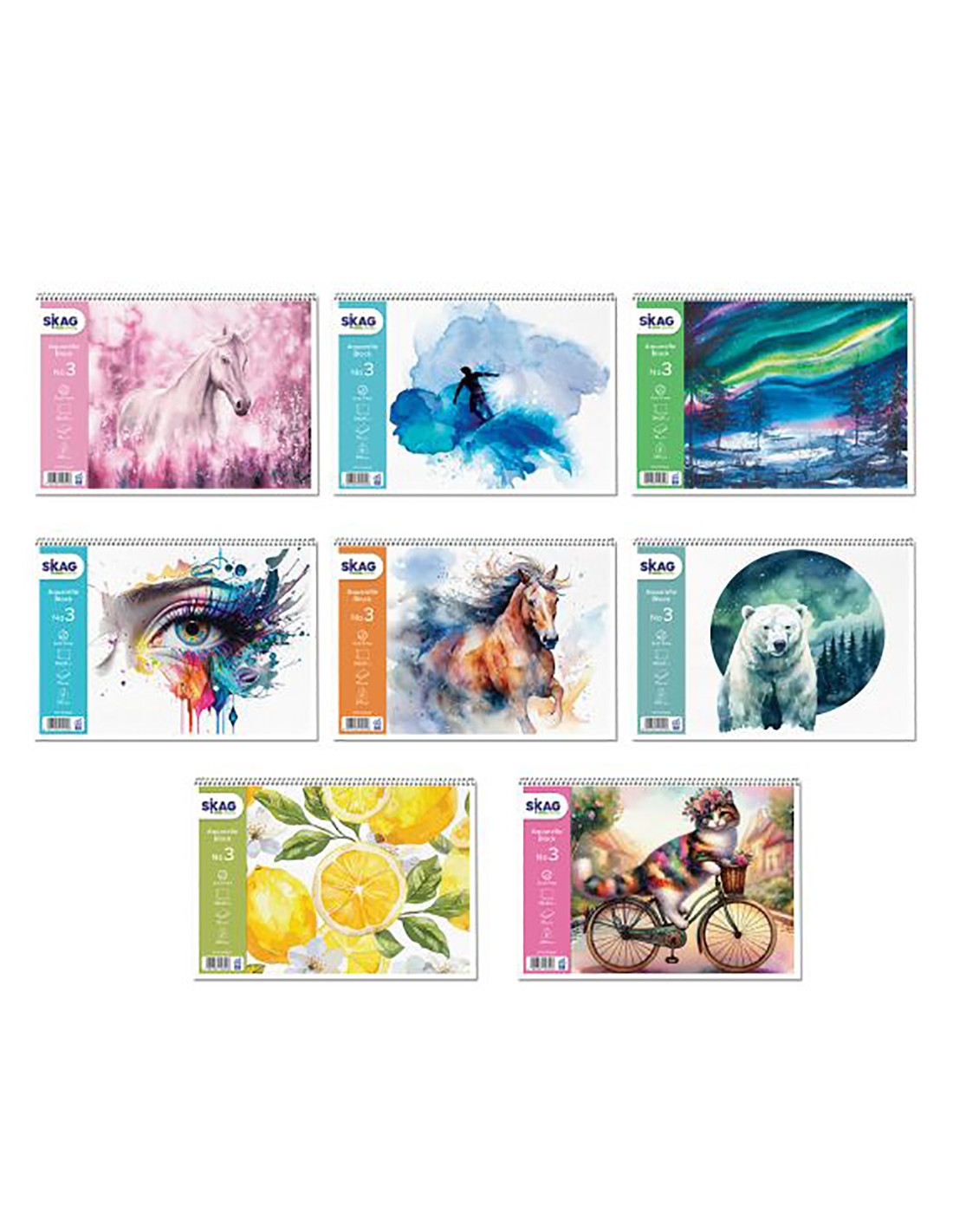 Μπλοκ Ακουαρέλας SKAG. Καλοσχεδιασμένα εξώφυλλα με απίθανα σχέδια και μαγευτικά χρώματα, που ζωντανεύουν την φαντασία κάθε επίδοξου καλλιτέχνη! Είναι κατασκευασμένα από χαρτί υψηλής ποιότητας, ιδανικό για ζωγραφική με χρώματα νερού.
