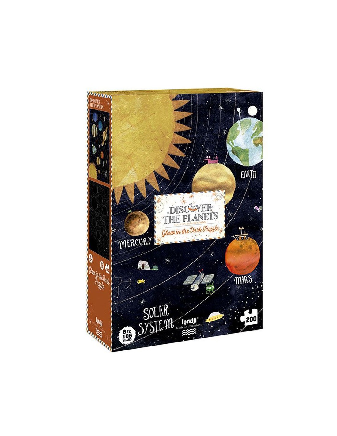 Discover the planets of our solar system with this beautiful puzzle of 200 pieces of Londji.But naturally in space there are not only planets!There are comets, spacecraft, UFO.But the best thing is that once you book the lights awaits a surprise.The thousands of stars will shine!Illustration: Carmen Saldana.Made of 100% recycled materials and designed in Barcelona from the Spanish company Londji.Puzzle Dimensions: 67 x 48 cm.